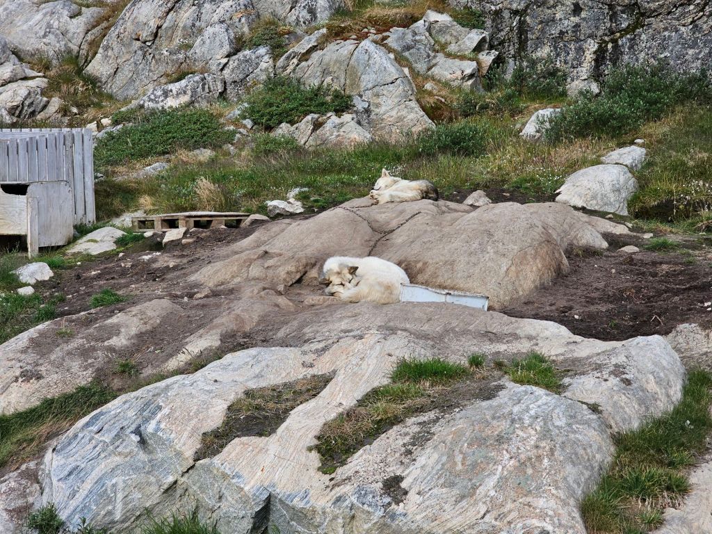 Along the way, we found the sled dogs. Gonna throw in some details I have gleaned since then. There are 5,000 people in Ilulissat and 3,000 dogs. These are working dogs. Never pets. Never do they get bomb pops or to go for car rides for pup cups at the coffee shop, or to recycle glass. These dogs are chained up and separated from one another. Per Greenlandic law, all dogs over 6 months must be chained. Puppies are allowed to roam free, but they just lay there and sleep. Some have dog houses. Some have pallets. Some have nothing. They are purebred Greenlandic Huskies. To protect the breed, no dogs can be imported. That means there are no labradoodles, no chihuahuas, no pugs, no Artichokes… And if the dogs leave Greenland, it is permanent exile–they can never come back. You aren’t allowed to pet the dogs, but really, they stink. Not to mention, they need a good brushing and a bath. But, if one of them bites you, they have to put down the whole pack. They are worried that YOU might pass disease to the dogs and wipe them all out. And, rumor has it they only eat 1 -2 times a week in the summer! All they are doing is laying around in the summer, not burning calories. Can you imagine if Artie Girl was fed 2x a week instead of 2x a day?! She starts following me around the house at 3:30, giving me the eye at 4:00, and pawing at my leg at 4:27. Meal time is serious business in our household!