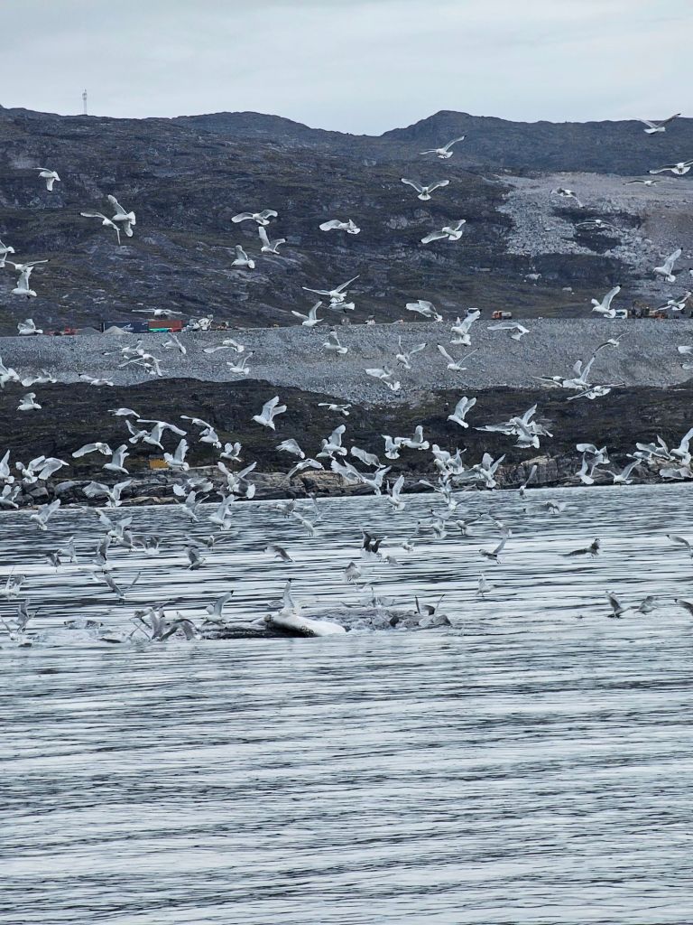 Finally, after about an hour, we stopped by a cliff full of nesting birds. There were thousands of them sqwacking and flying around.  It is a government protected site.  Our driver wasn’t sure if they migrate or are there year round because he is from southern Greenland just here for a summer job. While we took pictures of the evil birds, he scanned the horizon for whales. Alas, there were none. We started back to town, ever vigilant for signs of whale life. It was like we were living in a wide, wide world without wonderous whales (can’t think of anymore Ws to continue the alliteration at the moment). We spotted some seals, but they dove deep before we could even grab our cameras. So sad.