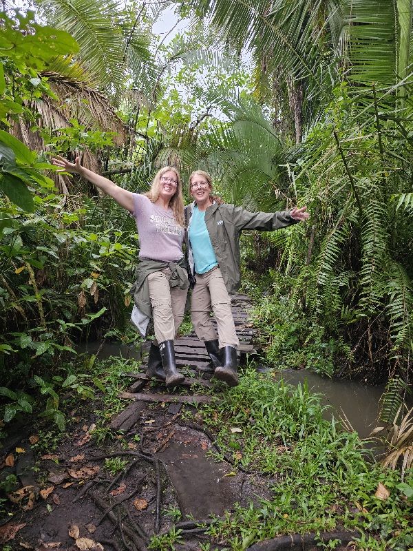 Then we said, “Sure, we will walk through the swamp.” There’s a “boardwalk” that goes through it. It’s replaced every 2 years and is due for an upgrade at the end of the upcoming rainy season. This means that half the boards are broken or missing, and the other half are on their way to be broken or missing.  And I guess they ran out of boards because most of the remaining ones were just circular branches cut in half that are a little tricky to walk on wearing gum boots.  Our guide would not let us carry our own cameras or cell phones. She put them in her backpack for safe keeping, which was a great idea. Then, about 25% of the way, she grabbed my hand and helped me along the rest of the way. Thank goodness! It was slippery and treacherous.  Luckily, it was fairly short, or you may have never seen thetwinsontour again. If it weren’t monkey dinner time, we would have been able to see more different species of monkeys in the swamp. But, honestly, I don’t know how that would have worked, standing on a rickety boardwalk with missing planks, looking up into the trees, and trying not to slip or lose my balance.