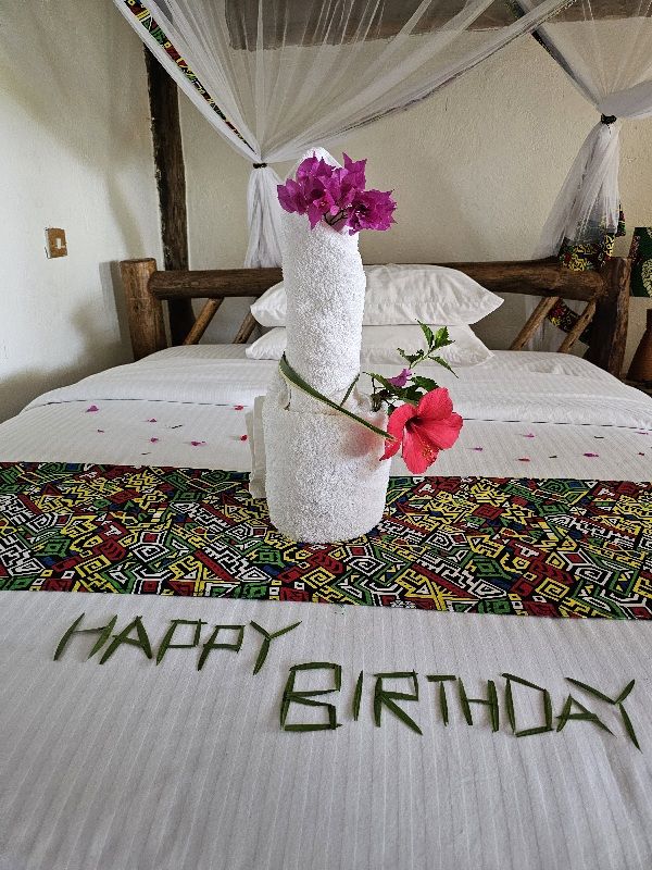 After that, it was back to the lodge for lunch. Shout out to Elephant Hab Lodge for the towel art cake and Happy Birthday written in flower petals on our beds.  Towel Art makes any birthday a Great Birthday!
