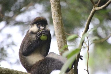 We were in a group of 8 people with a guide named Francis and two guards–one was named Titus and I don’t know the other’s name. Anyways, the guards are armed so they can protect you from aggressive forest elephants and angry chimpanzees. They just shoot “scare shots” in the air if necessary. thetwinsontour did get very excited at the mention of forest elephants–wouldn’t that be A-MAZ-ING? Alas, it was not meant to be. We did however see fresh elephant tracks, elephant dung laden with small orange colored fruit, an elephant “bathtub” where they like to wallow in the mud, and a  CHIMPANZEE eating the undigested fruit scavenged from the elephant dung! Next best thing to an elephant!