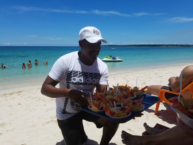 This was not just any Sunday, though. This was Pope Sunday. The. Pope. In Cartagena. Where 92% of the population is Catholic. And they have had no papal visits since 1986. It’s kind of a big deal. And, I might have bought a souvenir shirt to prove it. We had originally thought to avoid all the craziness of the Pope, but we quickly realized that this wasn’t possible. Almost everything was closed. And there were crowds of Colombians in Pope shirts, wearing Pope baseball caps, and waving Pope flags. We couldn’t get across the street to the old town because the police had it blocked off for the Pope to drive down. This was quite the conundrum because we were looking for breakfast. We found a nice little street kiosk that wanted to sell us a solo cup full of shrimp and other seafood things, but that just isn’t breakfast food even if thetwinsontour liked seafood. Fortunately, they also served juice so we were able to get a glass of Lulo juice, sit at their tables, sip our beverages and watch the faithful gathering at the barriers to wait on the Pope. All this excitement and joy began to spread. They told us the Pope should be passing by at any moment. We decided that we might as well wait and see the old guy. When in Rome, and all that Jazz. Except we weren’t in Rome, and neither was the Pope. We were in Colombia! We quickly realized we forgot the selfie stick in the hotel, and we would need to get decent pics since we were not on the front row. Fortunately, amongst all the people selling Pope shirts, hat’s, key chains, flags, posters, magnets, and statues, there was one man with selfie sticks for 10,000 pesos! What a deal! $3 bucks to add another selfie stick to our growing collection.