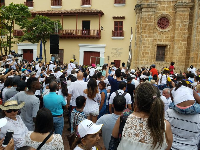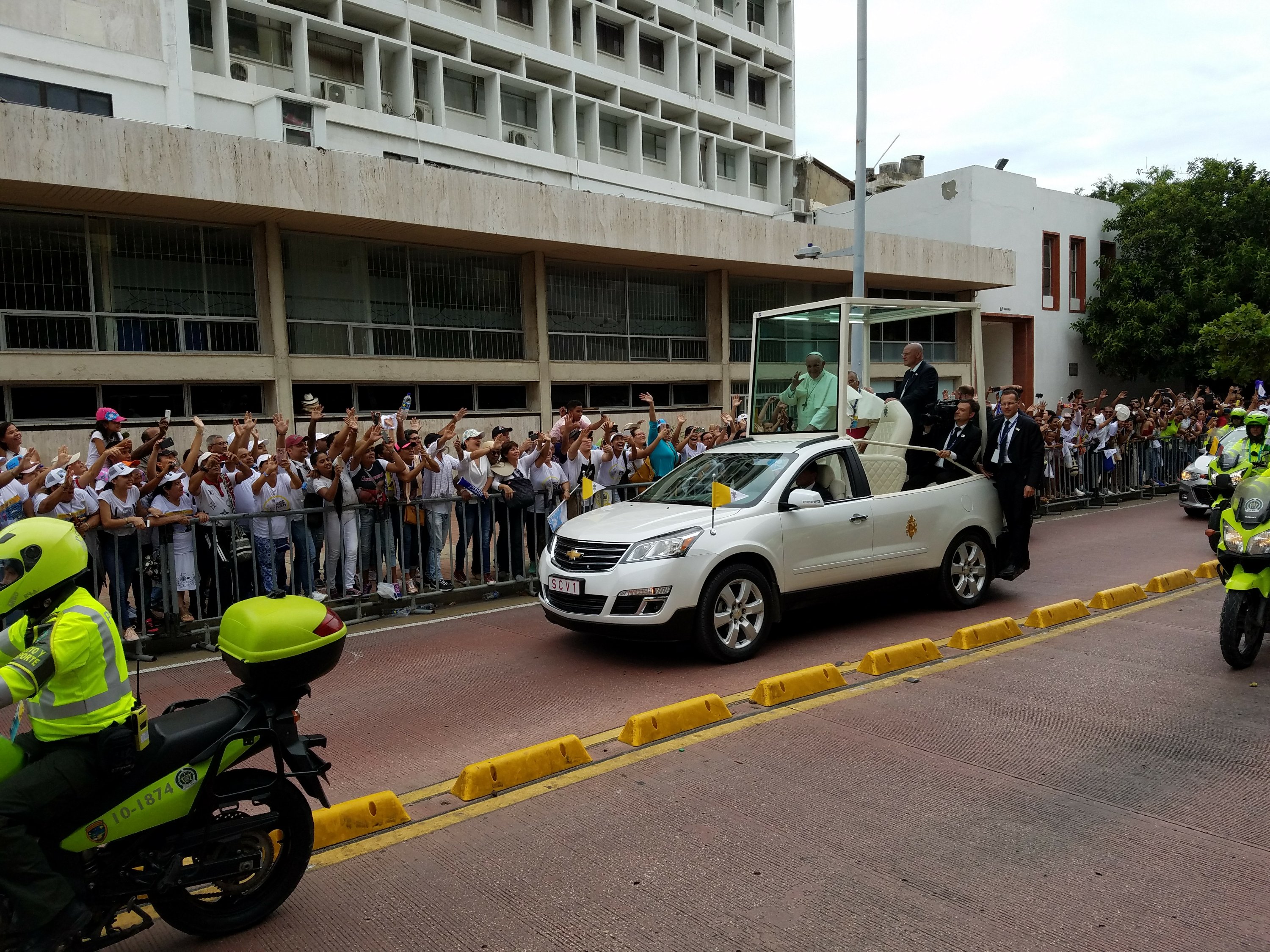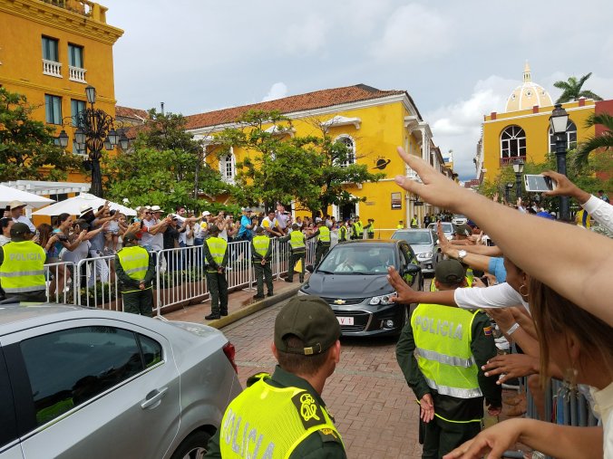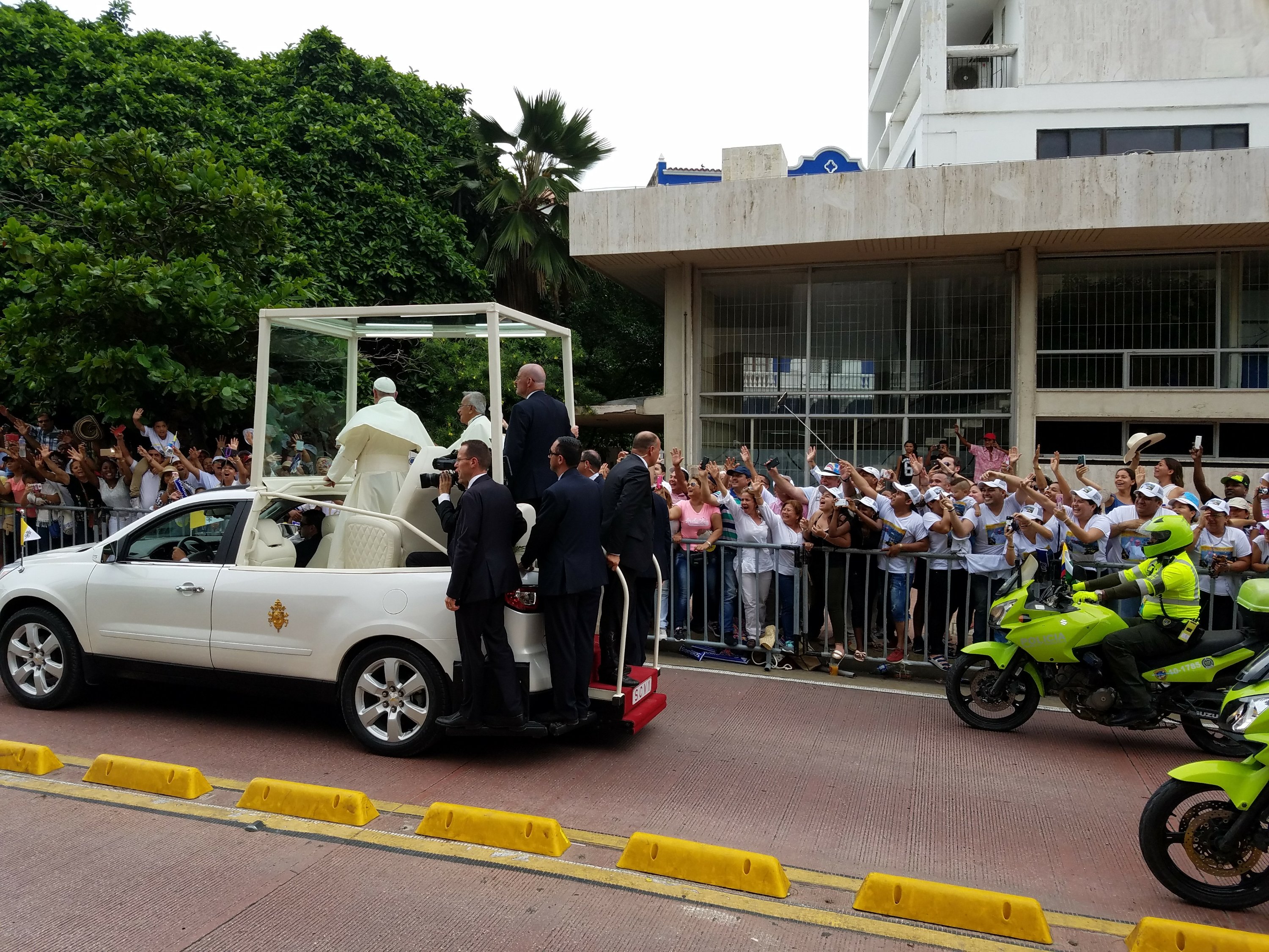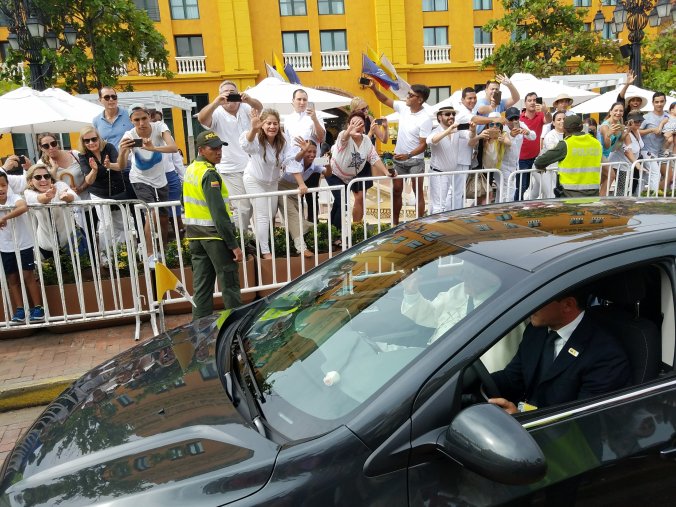 We waited. And waited. Pretty sure the Pope must have stopped for a nap. And we waited. We thought for sure the people would be singing Ave Maria or reciting The Lord’s Prayer or something, but nothing. Just people waiting in eager anticipation. Then the helicopters started to fly overhead. The police started driving down the road. Then there was a random taxi. Then more police on motorcycles. And more police. And then the TV cameras for the 24 hour Pope coverage. Then there was a shout, and the crowd started to roar! El Papa! El Papa! The Pope was coming! And suddenly, there he was, standing up in the glass-enclosed Pope Mobile! Pope Francis! And he was smiling and waving at me! And going way too fast. Within 10 seconds, he had flown past us and disappeared into the old town. I thought the Pope would drive at a more sedate speed. But all too soon it was over. The crowds dispersed quickly, and the man selling Pope hats packed them up and replaced them with Cartagena caps. But the men selling Pope shirts out of a suitcase were having a heyday selling up their shirts, $7,000 or 2 for $12,000. How can you pass up a deal like that? Thetwinsontour certainly couldn’t! And that’s how in our post Pope euphoria, we ended up with $2 Pope shirts that we will never wear, but that Pope fever sure is contagious!