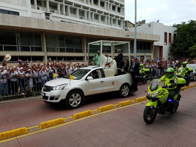 So we walked into the old town which was full of hopeful Pope- shirt -wearing people, and closed shops and restaurants. We were so intent on finding a bathroom that we missed the Pope 2 times. We knew that there was a bathroom in the Gold Museum (which we later found out was closed) so we tried to get there, but when we got to the church, the road was closed. We turned around to go another direction, but before we made it too far there was a cheer and an empty Popemobile. Then later, after we had found a bathroom we saw a crowd of people standing at a blocked off road. Again there was a cheer! The Popearrazzi, aka thetwinsontour went off at a run, I mean a slight jog, I mean a brisk walk. Alas he had already passed. So close!