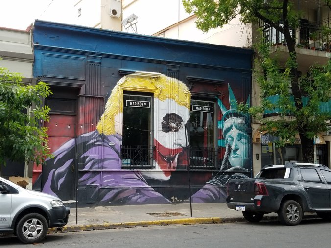 Despite all of the airport chaos, we had a very successful first day. We made it to the hotel by 12:30 and didn’t have to wait for a room to be cleaned. So then we were able to hop in a taxi and grab a quick lunch before our Graffiti walking tour at 3 o’clock. For lunch we had Argentian hamburgers. There are tons of hamburger places around. We may have eaten a cheeseburger, but it was a damn good cheeseburger made with authentic Argentinian beef.
