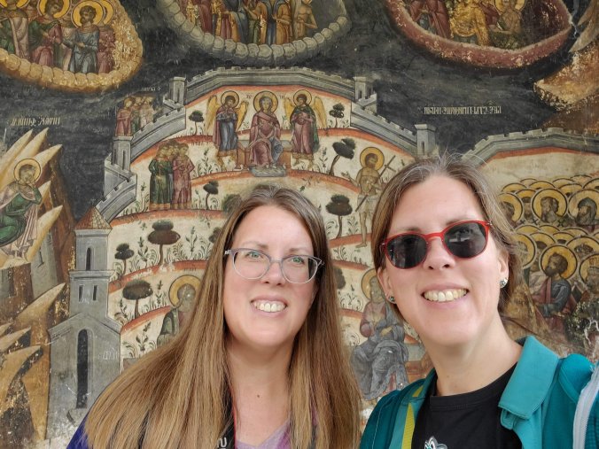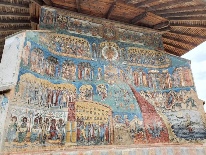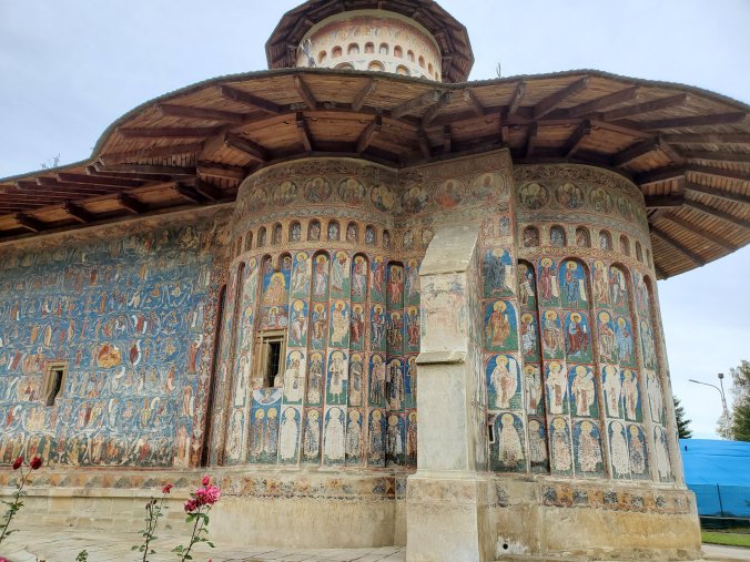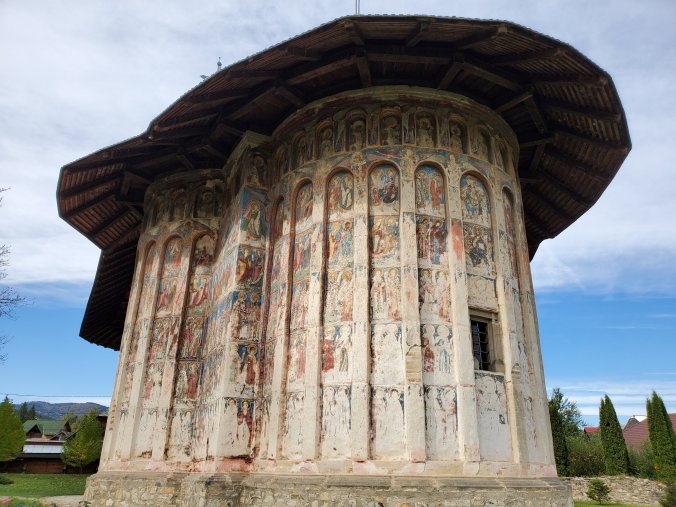The first that we went to was Voronet Montestary, often referred to as the Sistine Chapel of the east. It was built in 1488. Let me repeat that, 1488. That’s before Columbus sailed the ocean blue. That’s a really long time ago. I think they started the frescoes about 30 years after that, but still that was a long time ago.