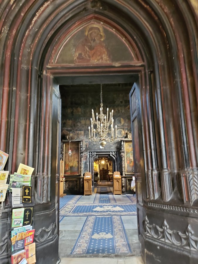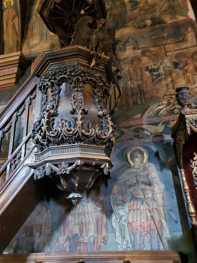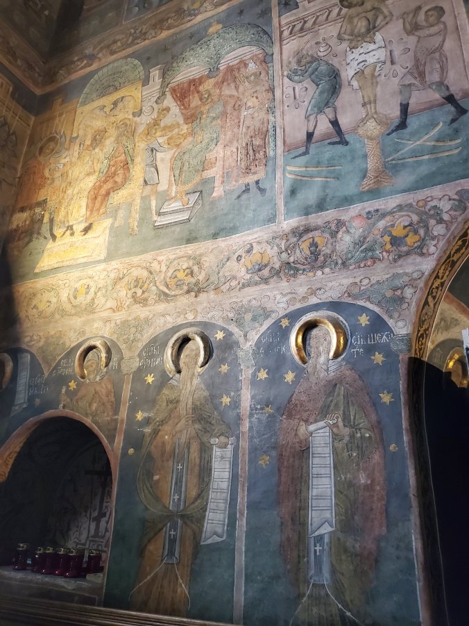 The church is rather small (most Orthodox churches are), but the inside is completely covered in paintings as well. The paintings are bright and vibrant. They were cleaned recently because after 500 years of burning candles, they tend to get a little dirty. But they didn’t touch up any of the paintings or repaint them. Just cleaned them up some.
