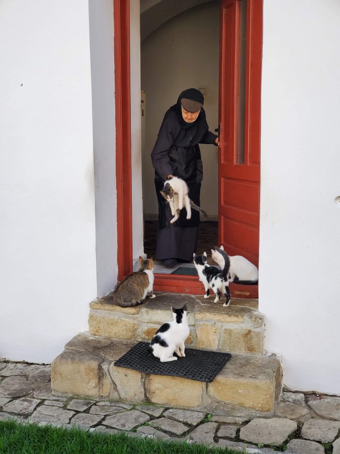 Our third and final montestary of the day was Neamt montestary. It was built in the 15th century. Yet it stands in stark contrast to the other two. It doesn’t have any paintings on the outside, just on the inside. And the paintings haven’t been cleaned, so some of the walls are so black that you can’t tell that there are paintings on them at all. But it’s still amazing despite the centuries of smoke damages. And they let you take pictures inside– without a photo tax! What a bargain. We all know thetwinsontour love a bargain!!