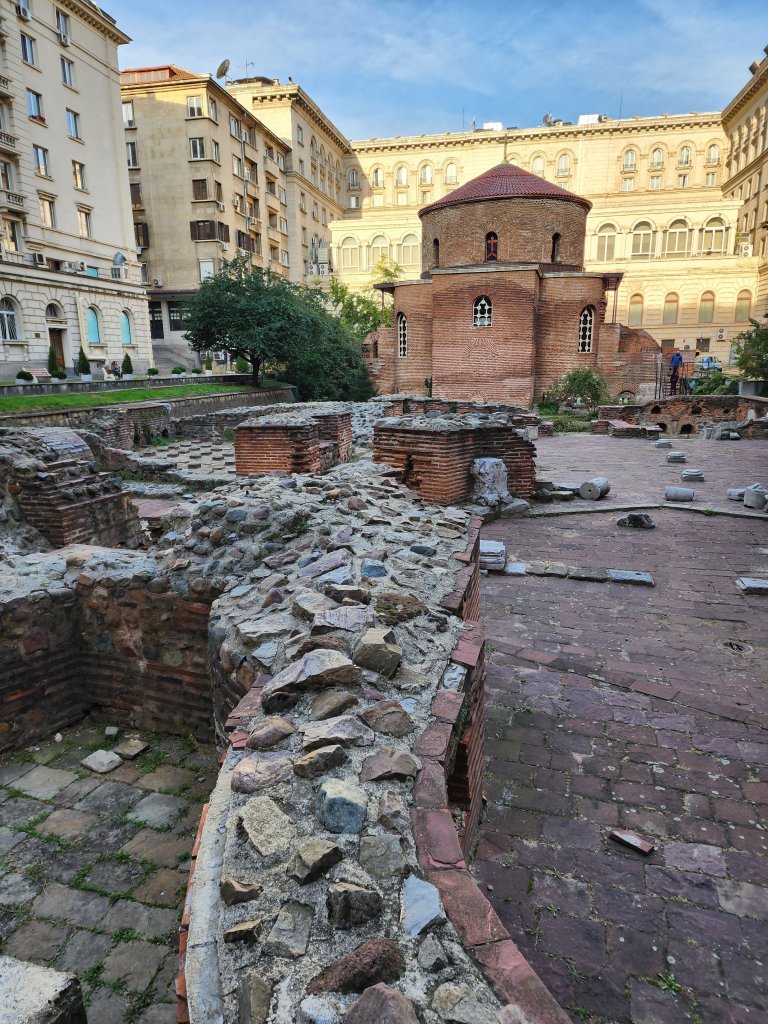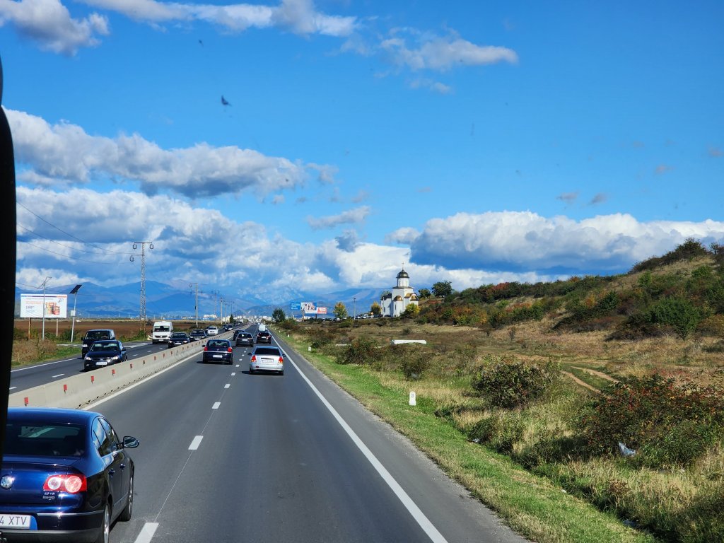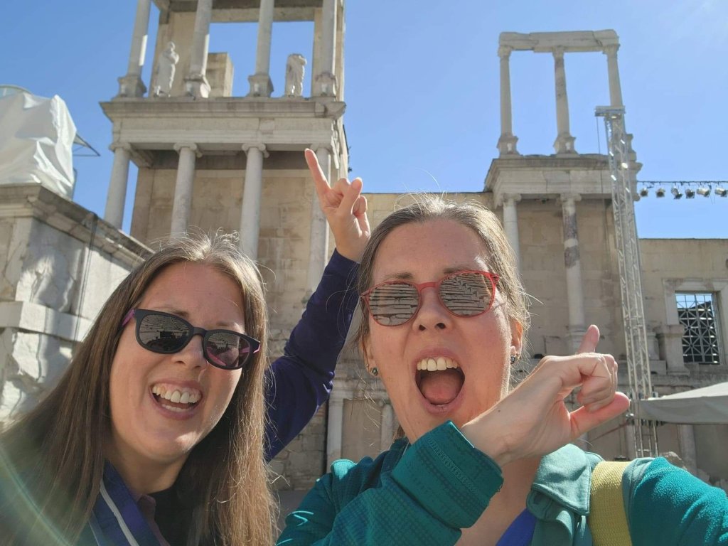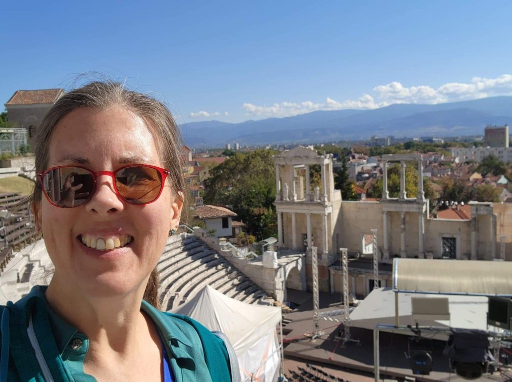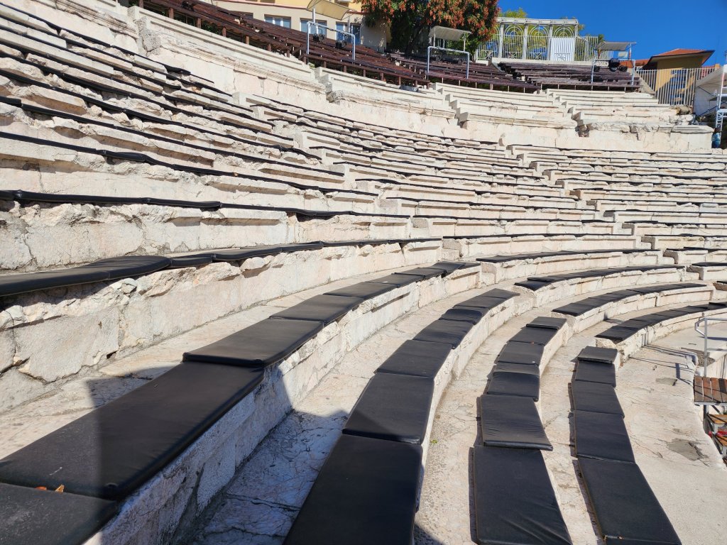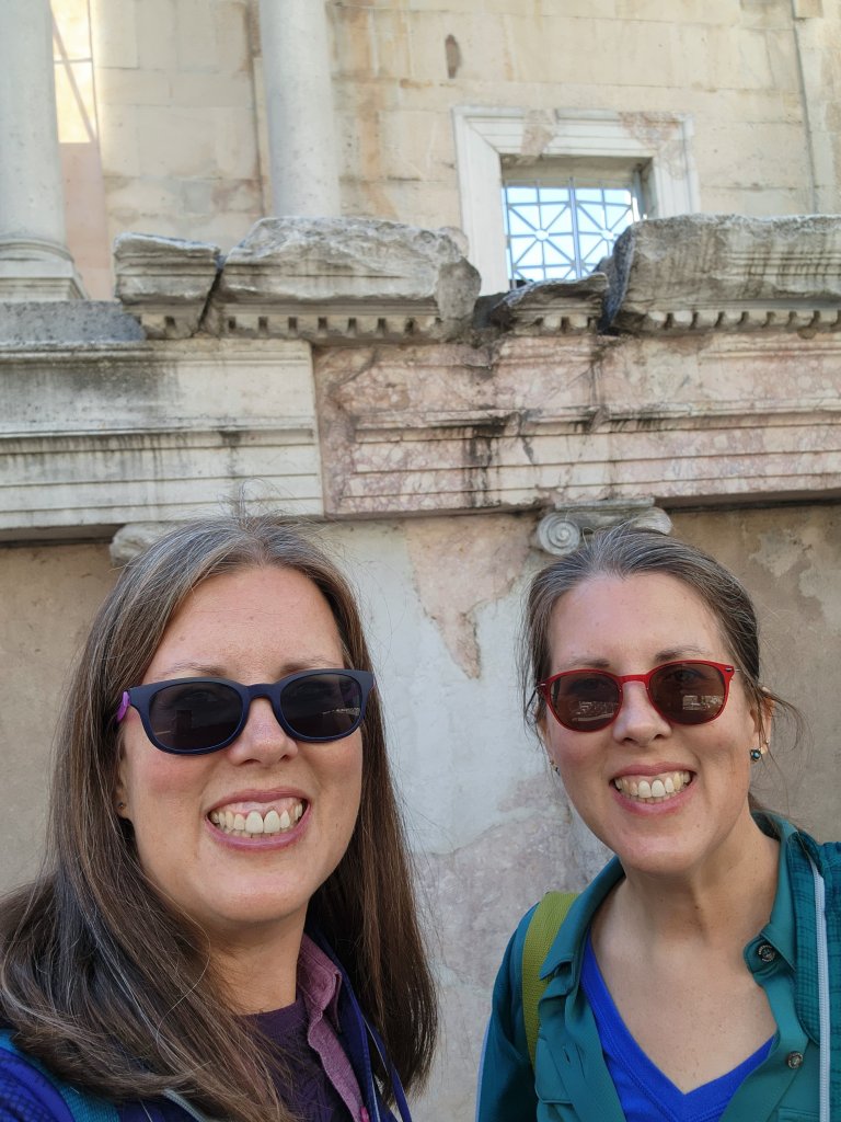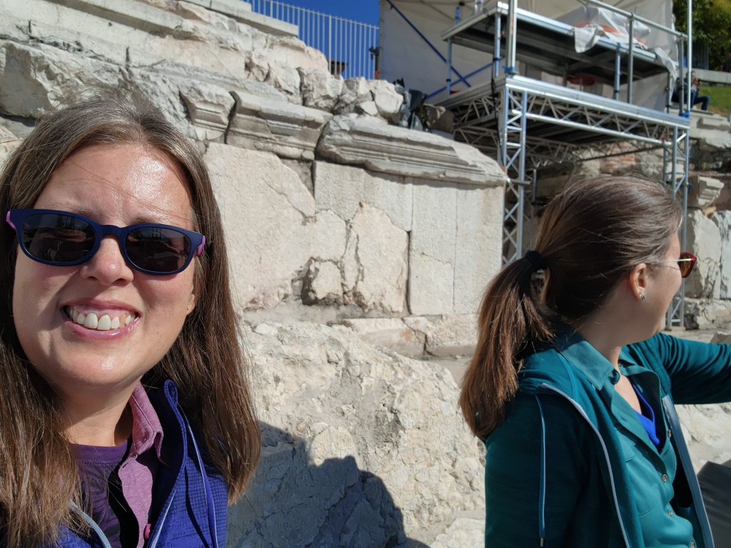 Today we were headed to Stobi to visit one of thetwinsontour’s favorite things–Roman ruins! There was an Amphitheater built in the 2nd or 3rd century AD. There is also what I think was the oldest Christian church built in Macedonia. Anyways according to the picture of the sign it was originally built in the 4th century, so it’s pretty ancient. There were these fantastic tile floors from like the 400s. It is still an active archeological site, but not in October–this summer they located a prison, which they were able to identify due to shackles and bones. We didn’t get to see the shackles, nor the bones as they had been shipped off to a museum or something. We had a fantastic local guide, who taught herself English as a child by watching Sponge Bob Square Pants and Nickelodeon. Her English was flawless with a perfect accent. And she was still in high school! thetwinsontour applaud education and the young, so we tipped her doubly. Our tour manager told us she was bloody fantastic. She kept everyone’s interest (even those of us busy taking selfies.)